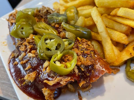 Deutsche Klassiker: Bratwurst, Currywurst, Schnitzel, Schaschlik, Gulasch, Kasselerbraten, alles mit den von Ihnen gewünschten Beilagen und mehr – traditionell zubereitet, mit Liebe serviert.